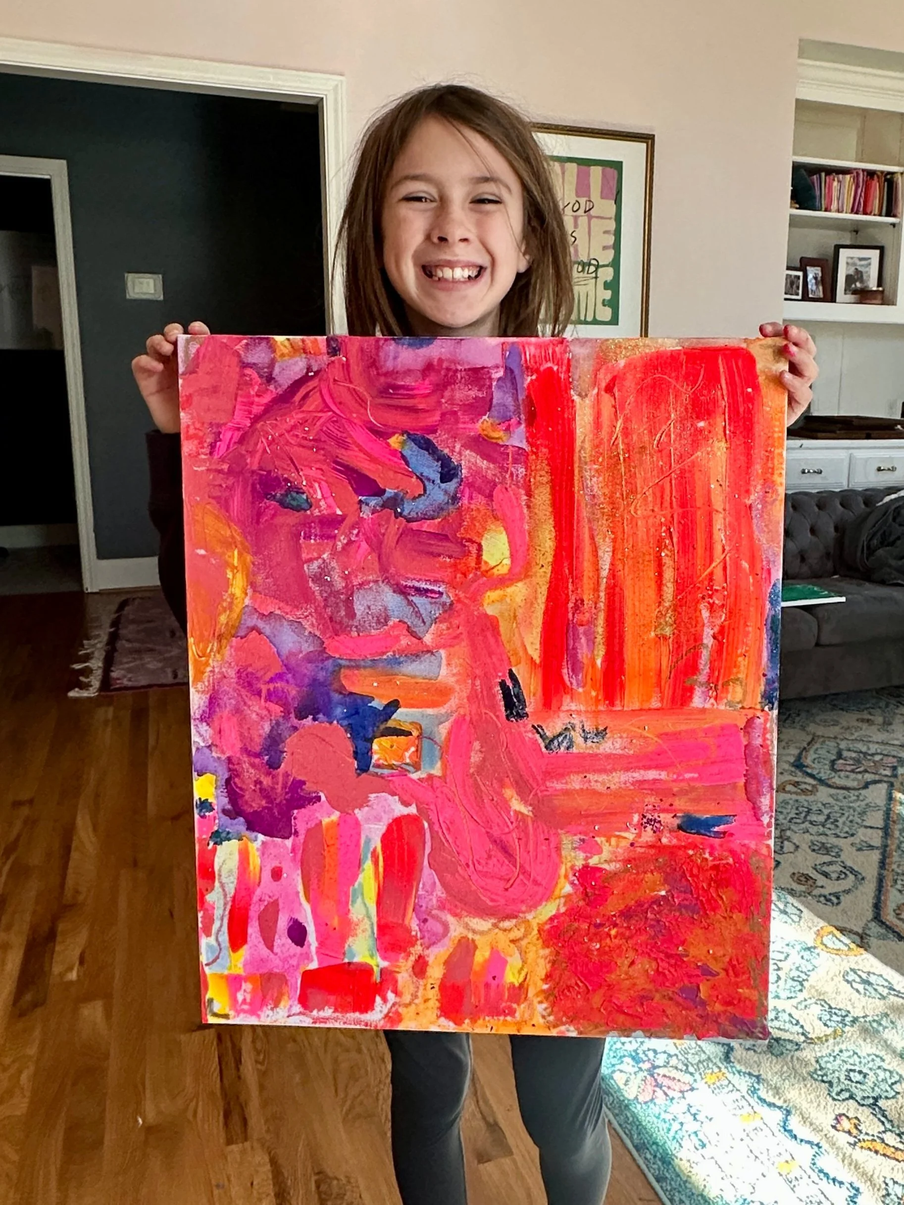 Kate is a 10 year old girl who loves to paint. The walls at home are out of space so she has come up with her very own business. She has very little formal training, just paints based on feelings and tries new techniques on a whim. Her paintings are bold, colorful and sparkly. She enjoys challenging herself with custom/commission pieces with colors she maybe wouldn’t ordinarily choose herself. Let’s see what she comes up with next!